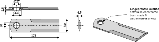 Halmsnitterkniv glat 175x50x4 ø20 (M/634-106 bøsning)